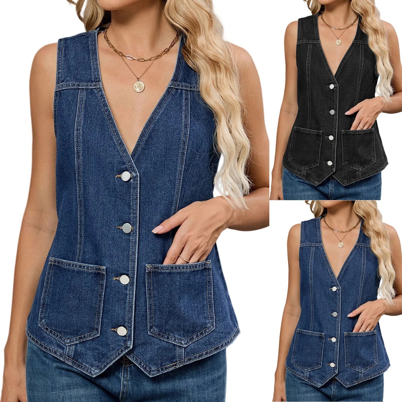 Add a retro edge to your wardrobe with this Womenโs Denim Vest, featuring a deep V-neck, slim-fitting cropped design, and practical double pockets. Perfect for layering or wearing alone, this versatile vest combines style and comfort for everyday spring and summer wear.